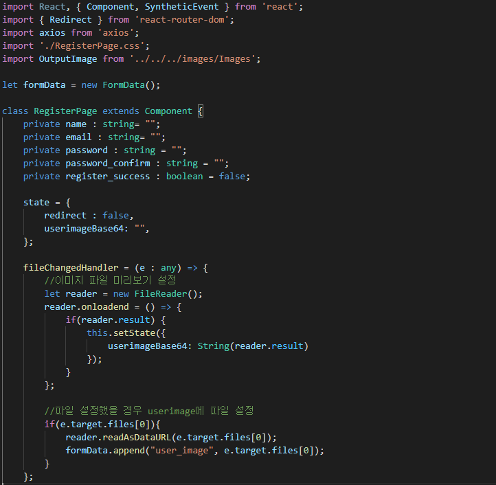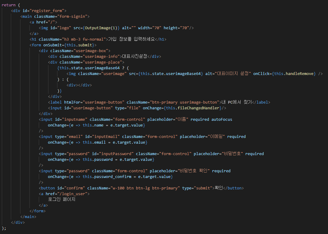 state를 이용하여 유저 정보 등록유무 및 이미지 미리보기()에 대한 내용을 저장해둔다.