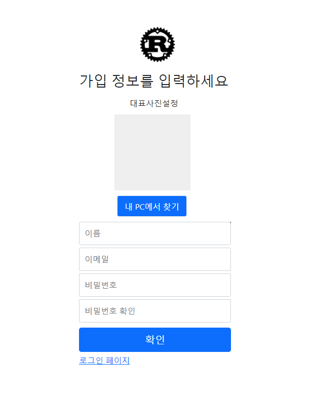 회원가입페이지 (대표이미지 설정, 유저이름, 유저이메일, 유저패스워드 입력기능)