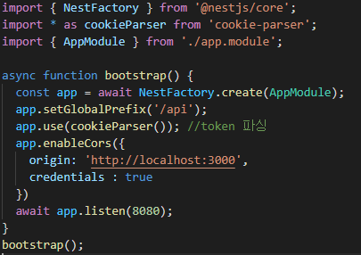 우선 클라이언트와 서버의 통신을 위해 서버(nestjs)에서 클라이언트의 포트번호에 대한 CORS 허용을 해주었다.