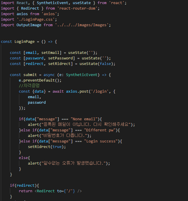 server의 결과(response)에 따라서 각각 메시지를 출력하거나, 성공했을 경우는 로그인이 된 상테로 메인페이지에 이동한다.