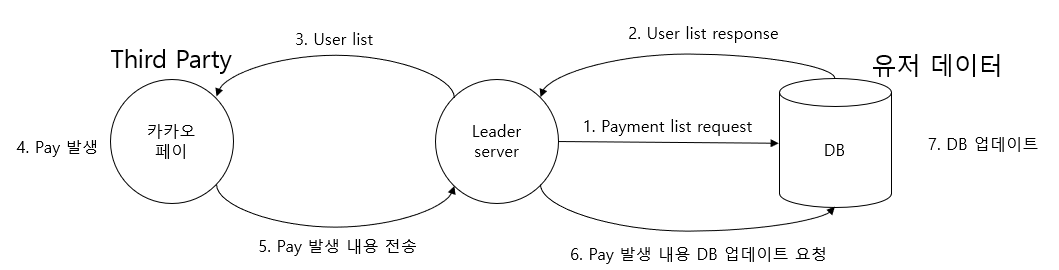 - Leader server는 응답받은 user list를 Third Party에서 payment를 진행하도록 User list 전송
