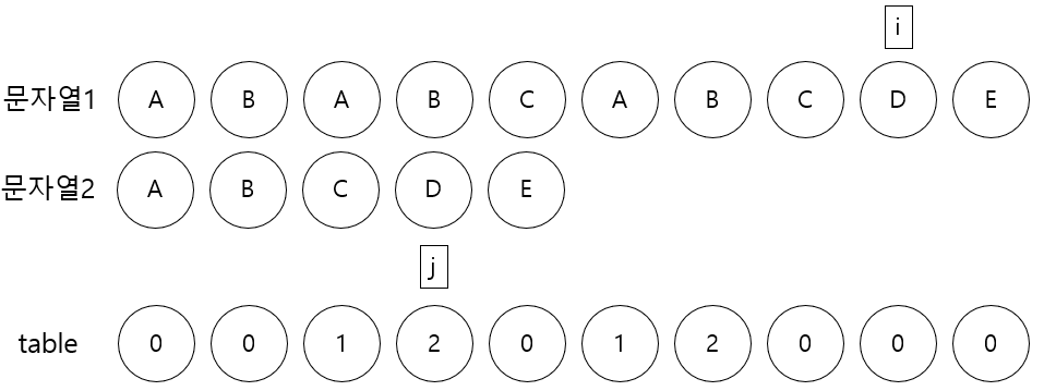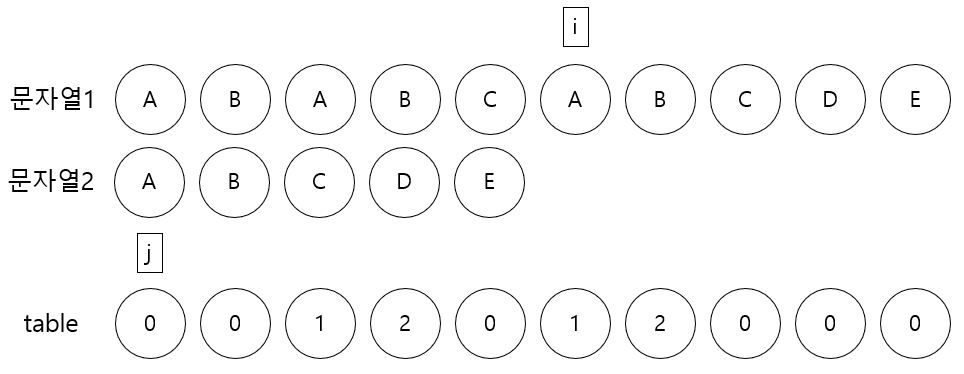 j가 0보다 크고 문자열1[i]와 문자열2[j]가 다를 동안 j = table[j - 1]을 반복해야 된다.