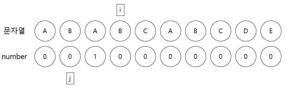 number배열을 완성하기 위해 2개의 포인터를 준비한다. i는 1번째 문자를 가리키고 j는 0번째 문자를 가리킨다.