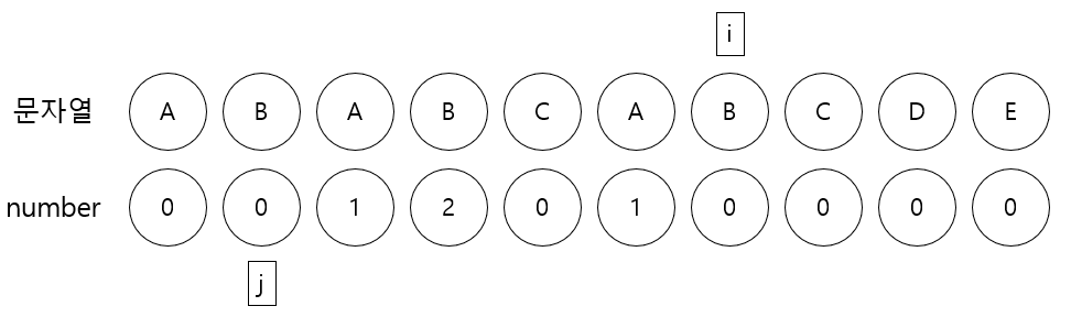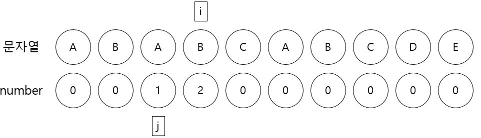 5. i가 가리키는 문자 A와 j가 가리키는 문자 A가 같으므로 j를 1증가한 후 number[i]에 j를 저장한다.