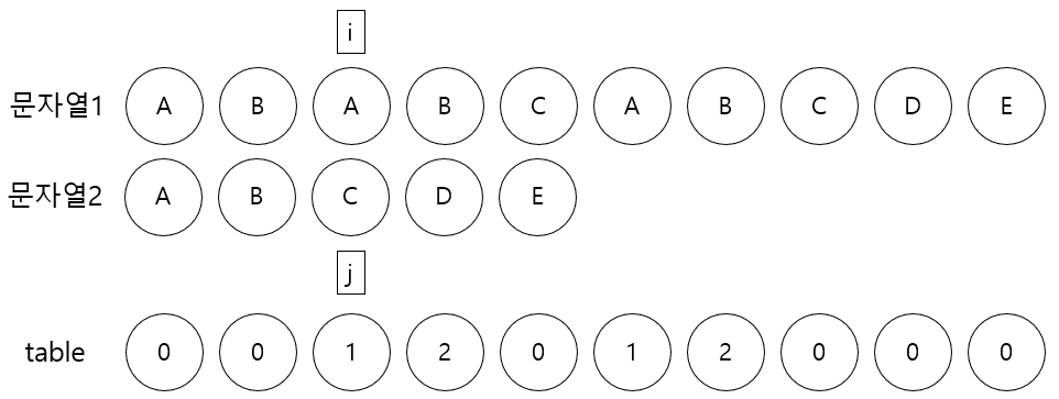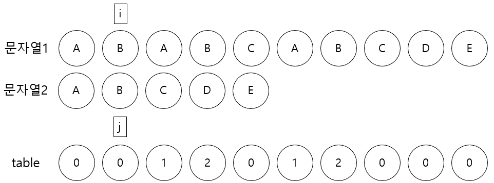 문자열1[i]와 문자열2[j]가 가리키는 문자가 다를동안 j에 table[j-1]을 넣는다, 즉 j는 0이 된다.