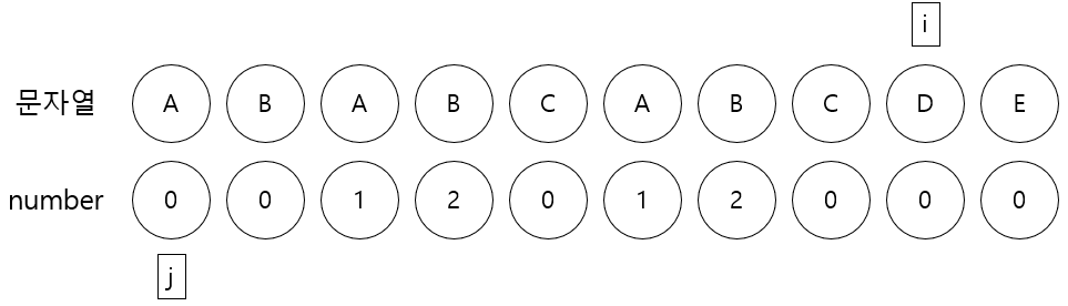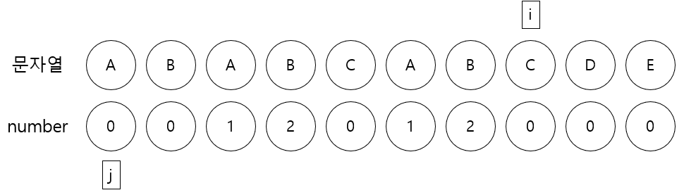 4. i번째 문자C와 j번째 문자A가 다르므로 j를 이동시키는데 여기서 j가 0보다 크고 i가 가리키는 문자와 j가 가리키는 문자가 다를동안 j에 number[j-1]를 할당한다.