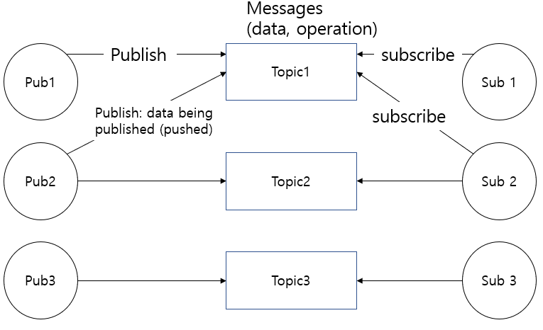 - publisher - subscribe 관계는 Server와 Client의 1:1관계성이 존재하지 않는다. Client는 자신이 subscribe하는 Topic만 listening한다. 해당 topic을 observe하며 변화를 listening한다.