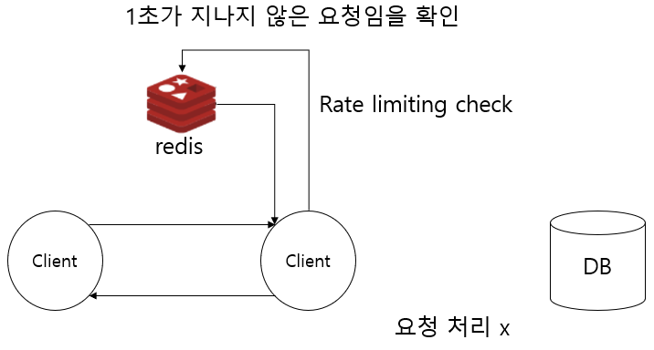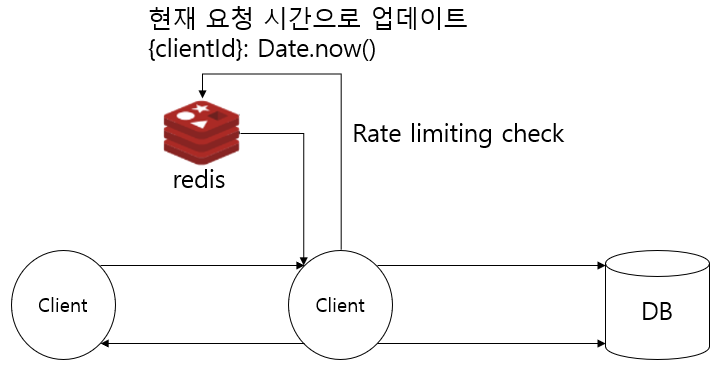 client가 1초마다 하나의 요청만 할 수 있도록 rate limit를 했다고 가정했을 때 Redis와 같이 access를 빨리할 수 있는 DB에 client 식별자를 key로 가장 최근 요청이 들어온 시간을 저장해둔다.