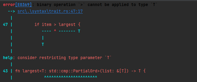 어떤 제네릭 상에서 어떤 trait으로 정의된 동작을 이용하기를 원하는 어떤 경우이든, 해당 제네릭 타입 parameter의 타입 내 trait바운드를 명시할 필요가 있다.