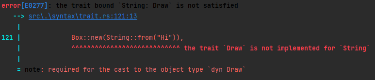 오류 내용을 보면 Draw에 대한 trait bound가 되지 않은 String을 넘겨주려고 하고 있다고 하며, String에 대하여 Draw를 구현하여야 한다고 한다.