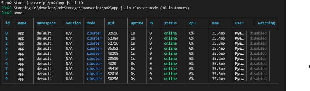 위에서 사용한 예제들은 PM2기본모드인 fork 모드로 application을 실행한다.