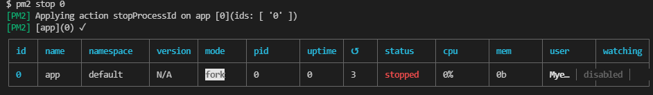 pm2 stop으로 application을 종료할 경우 status에서 stopped라고 뜬다.