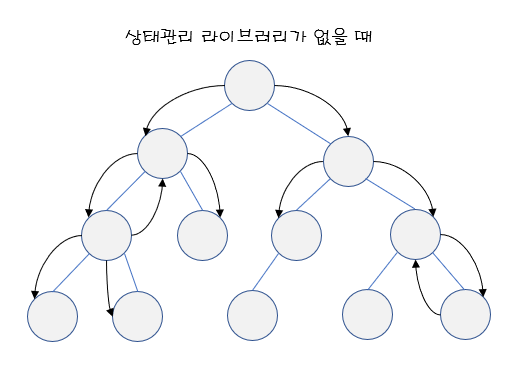 이러한 데이터들을 하위컴포넌트 또는 상위컴포넌트로 전달할 경우, 컴포넌트 트리가 깊어지면 상태관리가 복잡해질 수 있다. (아래 사진 참조)